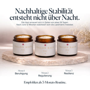 Vor der Anwendung die Haut mit einem milden Reinigungsprodukt von Schmutz und überschüssigem Öl befreien. So kann der Rindertalg seine volle Wirkung entfalten. Für beste Ergebnisse ist es wichtig, die Haut vor der Zubereitung gründlich zu reinigen. - Balm auf feuchter oder trockener Haut auftragen